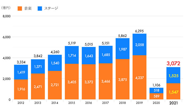 近年、ライブ市場は活況を呈しています。ここ2年は新型コロナウイルス感染拡大の影響で低迷していたものの、ライブ市場は右肩上がりで拡大しており、今後も成長が見込めるマーケットです。