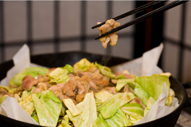 鶏肉とキャベツなどの野菜にしょうゆまたは味噌ベースの特製ダレを絡め、いためて食べる下呂の名物「鶏ちゃん」。