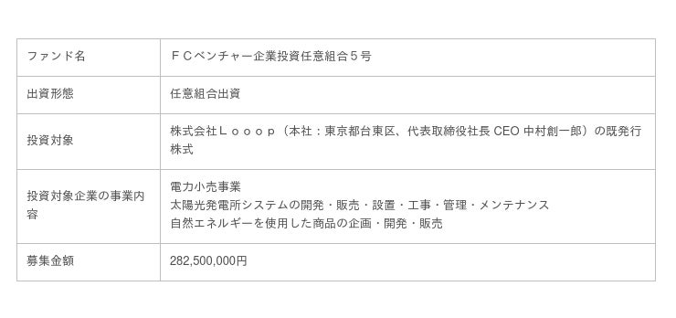 株式会社ファンドクリエーショングループ(本社:東京都千代田区、代表取締役社長:田島克洋、以下子会社も含めて総称して「当社グループ」)は新ファンドの「FCベンチャー企業投資任意組合5号」を設立し、株式会社Looop(本社:東京都台東区、代表取締役社長 CEO:中村創一郎、以下「Looop社」)の株主から既発行株式を取得し、投資を実行したことをお知らせいたします。