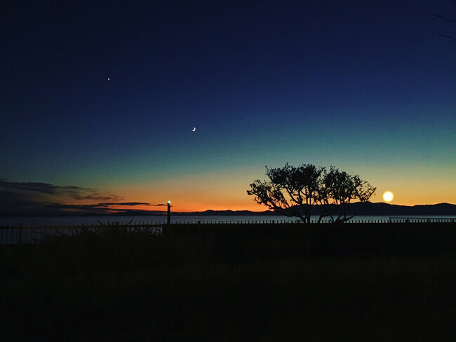 日本の夕日百選にも選ばれるこの場所の夕景は、琵琶湖に沈むサンセットが魅力。マジックアワーが魅せる感動の景色に、思わず歓声があがり「この景色を見るために、ここでのバーベキューを・・・」と言われるほど。明るい間は、琵琶湖に浮かぶ4つの島のうち3つ「多景島」「沖ノ島」そして「竹生島」が見え、対岸には比叡山から比良山系まで見渡せる、雄大な景色が広がります。