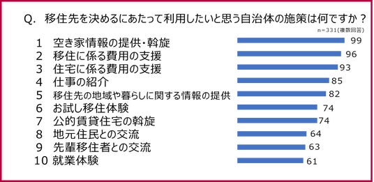 移住先を決めるにあたって利用したい自治体の施策の1位は「空き家情報の提供・斡旋」でした。次に、「移住に係る費用の支援」、「住宅に係る費用の支援」と続きました。