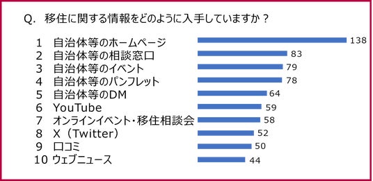 1位は「自治体等のホームページ」、2位以降も自治体等からの入手方法が続きました。また、デジタル技術を活用した新しい情報入手方法として「オンラインイベント・移住相談会」が7位となりました。YouTubeやX(Twitter)、口コミなどの生の声を求めている方も多い結果となりました。