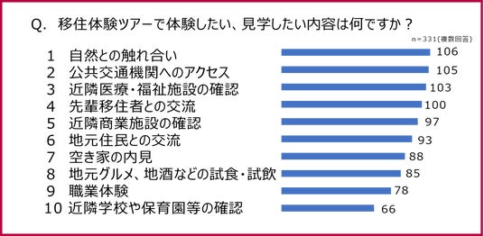 移住体験ツアーで体験したい、見学したい内容の1位は「自然との触れ合い」でした。次に、「公共交通機関へのアクセス」「近隣医療・福祉施設の確認」と続き、第4位は「先輩移住者との交流」となりました。