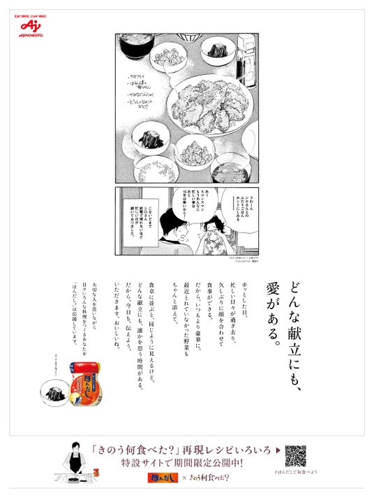 味の素株式会社(社長:藤江 太郎、本社:東京都中央区)は、当社の和風だしの素「ほんだし(R)」の、 “和風だしで毎日の食卓に安らぎやよろこびをもたらしたい、料理をつくる人を応援したい”というブランドコンセプトと、よしながふみ先生の人気漫画『きのう何食べた?』(講談社刊)で描かれている、“料理は、大切な人を思う時間”というメッセージを重ね、同作品とのコラボによる“どんな献立にも、愛がある。”をテーマとした企画を2024年8月1日(木)より開始します。