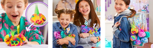 今回、初めて約5cmのミニサイズのファービー ファーブレッツが登場します。キャラクターは6種類(オークゥ/ラブリィー/ヒップボップ/メロニィー/ピクセレー/レイヴィー)です。45種類以上の音や歌、ファービー語の組み合わせで反応し、キャラクターごとに得意な曲のスタイルがあるので自分と相性の良いファーブレッツと出会えます。大きな耳を閉じたコロンとした愛らしいフォルムが特徴的で、ファーブレッツを集めると、仲間同士で一緒にコーラスしてくれます。クリップが付いているので、バッグに取り付けて一緒におでかけもできます。さらに友達同士でおそろいにしたり、たくさん集めて遊ぶこともできます。