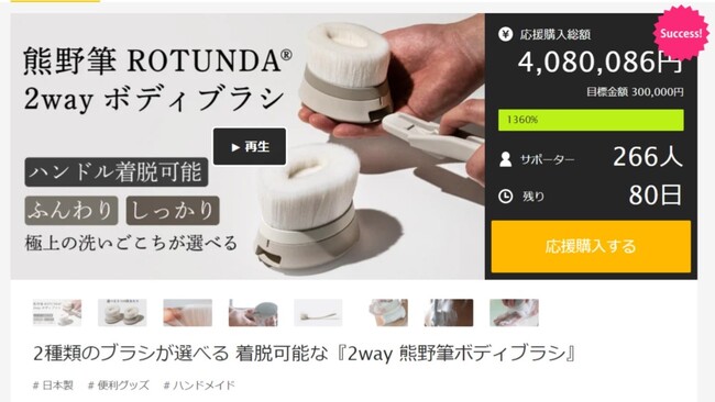創業90余年 村岸産業株式会社が手掛ける シリーズ累計販売数19,000個を誇る「熊野筆ROTUNDA(R) (ロタンダ) シリーズ」の第3弾プロジェクト【2種類のブラシが選べる 着脱可能な『2way 熊野筆ボディブラシ』】は、2023年2月27日まで 応援購入サービス Makuake(マクアケ)にて先行発売を実施いたします。