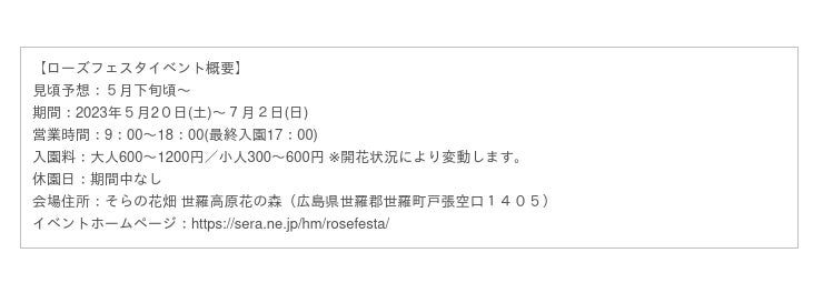 中四国初のイングリッシュローズの森へようこそ。世羅町で最も標高の高い540mに位置する花の森では、寒暖差の大きな気候を生かして長期間ばらを鑑賞することができます。約20000平方メートル 万平方メートル150品種7200株のバラと200品種の宿根草が彩るナチュラルガーデンには、イングリッシュローズ特有の可憐な花型と優しい色合い、そして豊かな香りが広がります。初夏の圧倒的なばらのボリュームをご堪能ください。