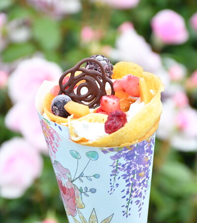 季節のフルーツをトッピングしたオリジナルのクレープ。生地はもちもち、世羅の卵とはちみつを使用。