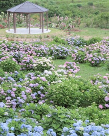 西日本初のあじさいとタチアオイが同時に楽しめる丘では、約25000平方メートル のほかに、115品種3500株のあじさいと3500株のタチアオイが高原を色付けます。近年では品種数も多く、さまざまな色・花形のものが増えてきて人気も高まるあじさい。花の観光地ならではのロケーションを活かした植栽をご覧ください。