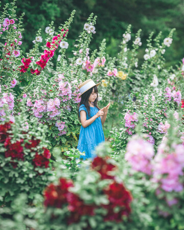 ブルーの配色が多いあじさいと、カラフルなタチアオイを一緒に楽しめるのも特徴。