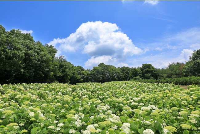 通常のあじさいより、小さな花をつける可憐なアナベル。ここでは森の中一面に広がる景色がご覧いただけます。開花期も長くおすすめ。隠れたピンクのアナベルも探してみて!