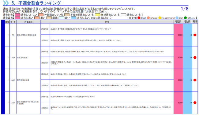 不適合割合ランキングは、マニュアル品質を改善する上で、対応の優先度が高い項目から示しています。ここでの「適合割合」とは、適合している割合(定量的な評価)のことで、「適合品質」とは適合している箇所のクオリティ(定性的な評価)を示しています。個々の品質項目には重要度に加え、専門家による品質改善のための対応指針を参考情報として示しています。