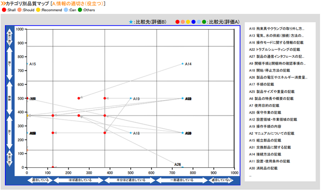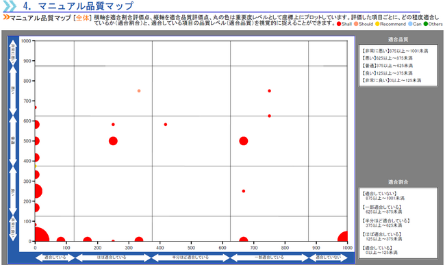 品質マップはマニュアル全体の品質を俯瞰して見るために利用し、「適合していない」エリア以外のプロット点は左下方向へ分布するほど品質が優れており、右上方向に分布するほど品質が劣っていることを示しています。