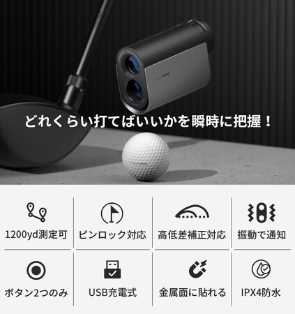 最大の特長は1200ヤード(約1000m)までの距離を測れることです。どんなに長いコースでも「どのクラブを選ぶべきか」「どれくらい打つべきか」を瞬時に測定します。