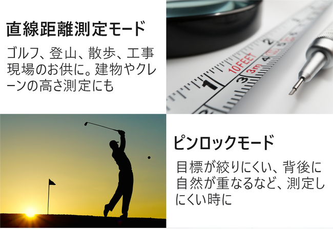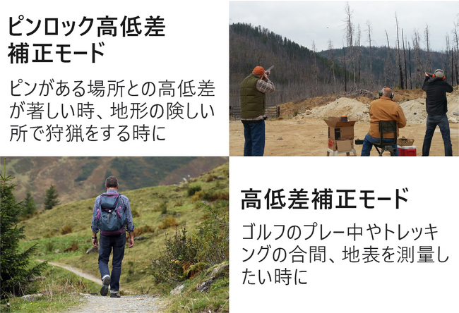 4つのモード機能を使いこなすことで、ゴルフ場でのあらゆる場面に対応できます。「ピンの後ろに木々が生い茂って的が絞りにくい」「高低差が大きくて真に打つべき距離が分からない」などの状況に陥ってもノープロブレムです。しかもモード切替はボタンを押すだけという簡単なもの。