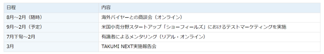 「TAKUMI NEXT」は、2019年度から実施。地域資源を活用した高付加価値商材の海外販路拡大を目指し、日本全国から次世代を担う「匠」企業を募集、「匠」企業の海外販売を、経営面、販売面、広報面から総合的に支援する通年プログラム。