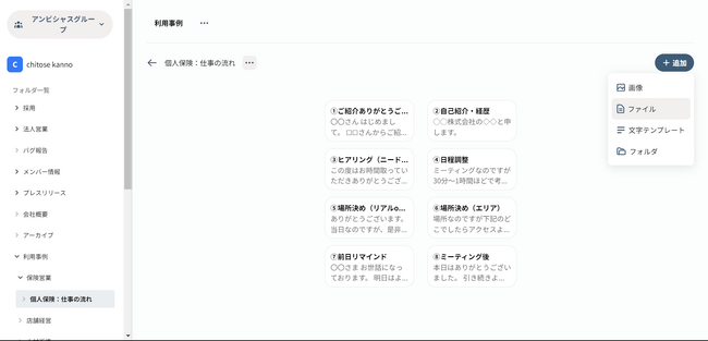 スマホのキーボードに定型文・資料・画像など利用頻度の高いコンテンツを登録することでワンタップで送信できます。キーボードをチームで共有することで、全ての営業担当者の会話をより効果的にします。