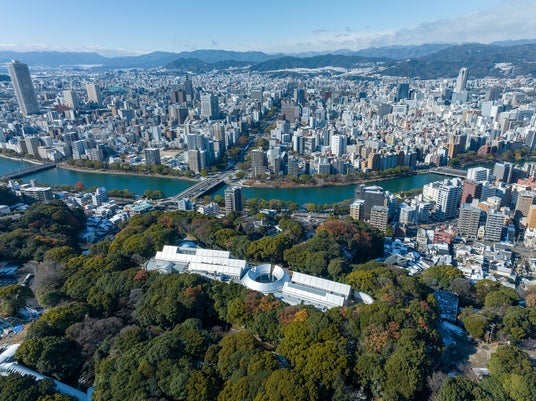 広島市現代美術館は、全国で初めて現代美術に本格的に取り組む公立美術館として1989年5月3日にスタートしました。建物は、建築家・黒川紀章による設計で、市内を見渡す緑豊かな比治山公園に位置しています。自然の景観と調和しながら、美術館としての先駆性が表現されており、垂直軸に沿って下から順に自然石、タイル、アルミと変化する素材は、過去から未来への文明の発展や時間の流れを表し、設計者独自の「共生の思想」を体現しています。2023年3月、2年3ヶ月の改修工事をへて、リニューアルオープン。今年5月3日には、開館35周年を迎えます。