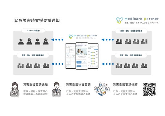 地震・豪雨・感染症など、突発的な災害において必要とされるのが“即応性”です。「Medicare-partner」は、行政機関や災害支援団体からの支援要請を、有資格者および事業者に迅速に通知できる「緊急災害時支援要請通知機能」を搭載しました。