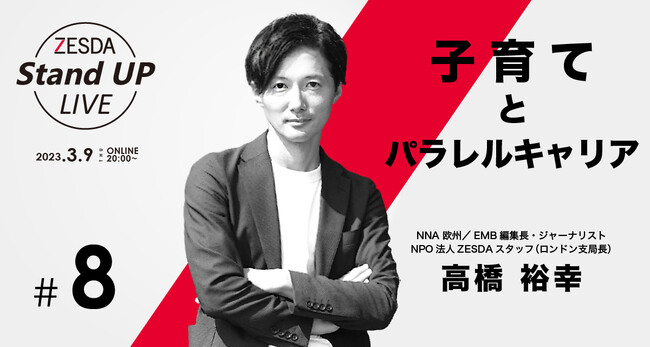特定非営利活動法人ZESDA(代表理事:桜庭大輔、所在地:東京都中央区、以下NPO法人ZESDA)は、2023年3月9日(木)に『ZESDA Stand UP LIVE#8』をオンライン開催いたします。今回は、NNA欧州/EMB編集長・ジャーナリストであり、NPO法人ZESDAスタッフ(ロンドン支局長)の高橋裕幸さんより、「子育てとパラレルキャリア」というテーマでお届けします。