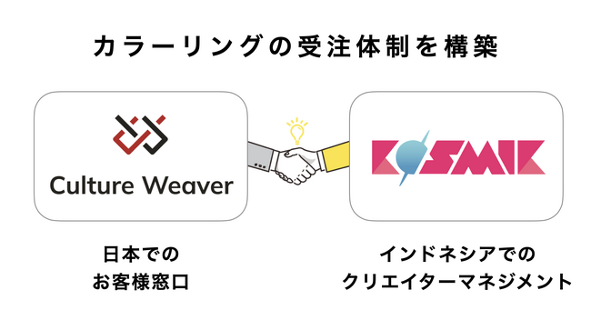 漫画を中心として国際的なコンテンツビジネスを支援するカルチャーウィーヴァー合同会社(本社:東京都豊島区、代表:平柳竜樹、以下「カルチャーウィーヴァー」)は、インドネシアのコミック出版社兼制作スタジオ「KOSMIK」と業務提携をしました。これにより、カルチャーウィーヴァーは、これまでのコンサルティング業務に加えて、業務プロセスのアウトソーシングサービスを提供することができ、KOSMIKは、これまでの韓国のクライアントに加えて、日本企業を新たな顧客としてサービスを拡大することが可能になります。