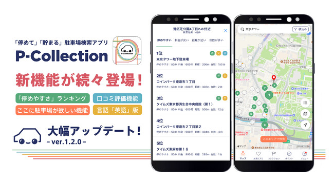 独自アルゴリズムで「停めやすさ」の数値化にチャレンジする【無料・ポイ活機能付き】駐車場検索アプリ「P-Collection(ピーコレクション)」新バージョン1.2.0リリースを発表!