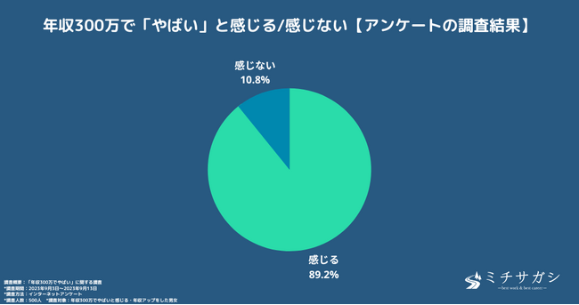 キャリア・転職メディア「ミチサガシ」(https://miyablog.me/)は、年収300万円で「やばい」と感じる男女、年収アップを実現したことのある男女を対象に「年収300万円がやばいと感じる理由」と「年収アップで最も効果があった行動」に関するアンケートを実施しました。