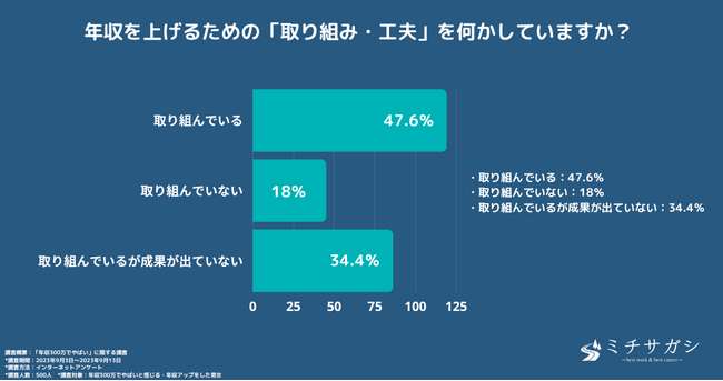 年収を上げるための「取り組み・工夫」に関し、「取り組んでいる」と答えた方が47.6%、「取り組んでいない」と答えた方が18%、「取り組んでいるが成果が出ていない」と答えた方が34.4%という結果になりました。年収アップのための取り組みを実施している方が半数近くを占める結果となり、一方で、その取