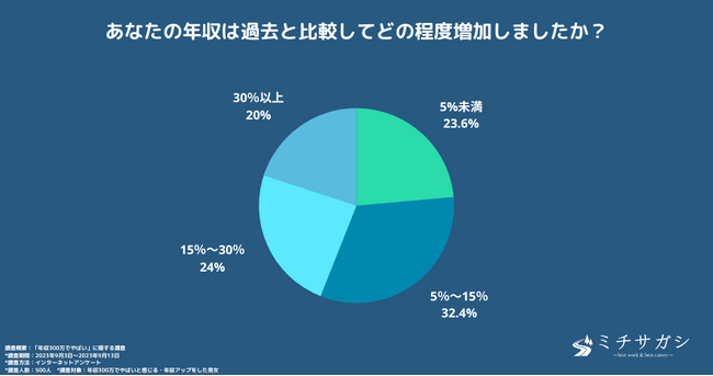 過去の年収と比較し、「5%未満」の年収アップをした方が23.6%、「5%~15%」の年収アップをした方が32.4%、「15%~30%」の年収アップをした方が24%、「30%以上」の年収アップをした方が20%という結果になりました。多くの方が少なからず年収アップをしている結果でした。