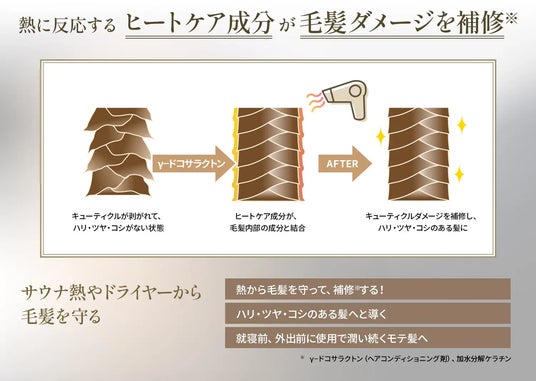 熱に反応するヒートケア成分が毛髪ダメージを補修。サウナ熱やドライヤーから毛髪を守る。ハリ・ツヤ・コシのある髪へと導く。