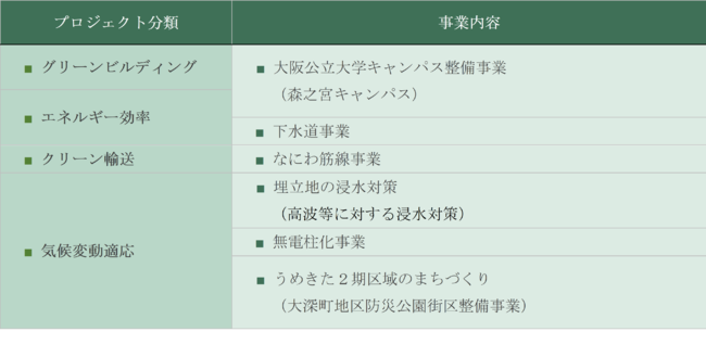 本債権の調達資金は、CO2排出量削減や気候変動への適応に向けた大阪市の6つのプロジェクトに充当されます。