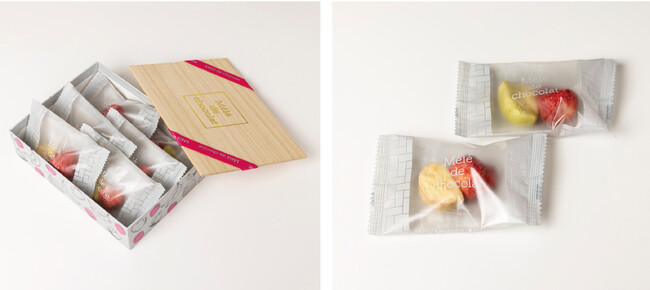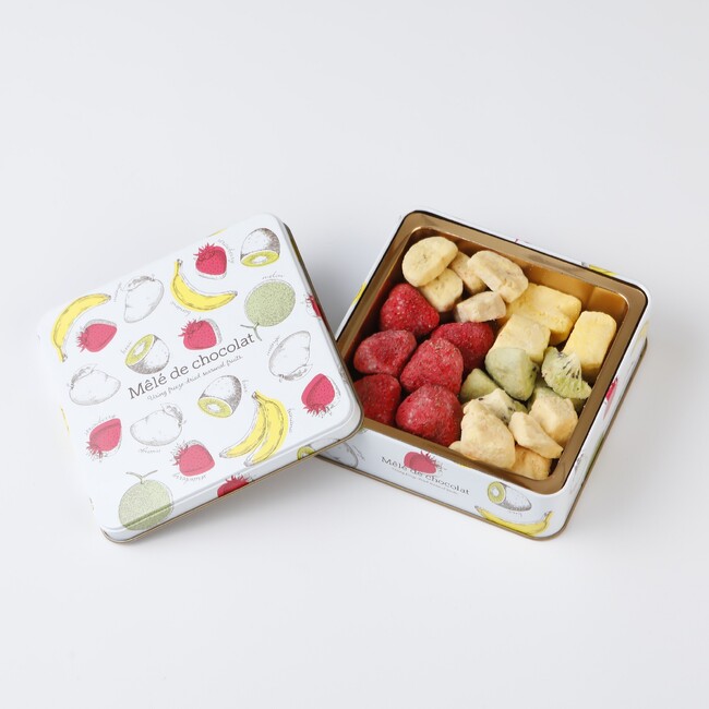 ストロベリー、バナナ、メロン、キウイ、マンゴーのしみこみショコラがひと箱で楽しめます。