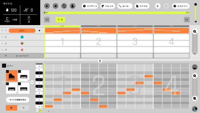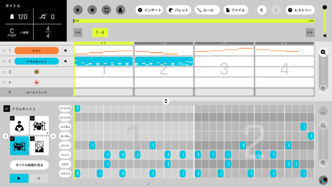 「カトカトーン」は、主に小学校3年生以上を対象とした、教育現場で活用できる音楽Webアプリケーションです。初心者でも分かりやすく音楽作成ができる機能を備え、プログラミング的思考の育成につながる体験ができます。また、つくった音楽を書き出して学習支援ソフトウェア等を通じて共有することができます。