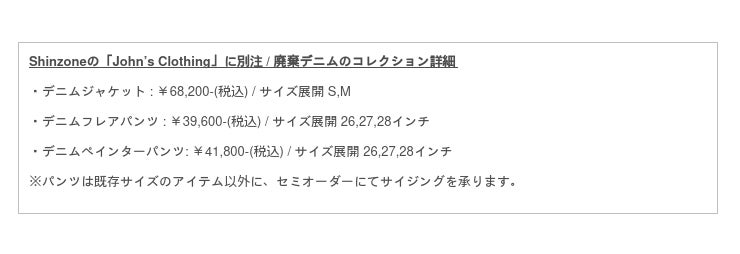 ブランド設立当初からShinzoneのコンセプトは「デニムに合う上品なカジュアル」。20年以上経つ今もブランドにとってデニムは欠かせない存在です。同店のオープンを記念し、廃棄デニムのコレクションを「John’s Clothing」に別注いたしました。また、エッセンシャルアイテムの「CHRYSLER PANTS(クライスラーパンツ)」を、ブランドのコットンリネンの残反生地で展開いたします。(詳細は下記に記載)