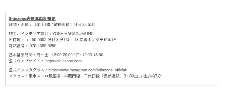 このたび株式会社シンゾーン(本社:東京都渋谷区渋谷/代表取締役染谷裕之) は、運営ブランド「Shinzone」の新店舗となる「Shinzone表参道本店」を2023年5月18日(木)に出店いたします。
