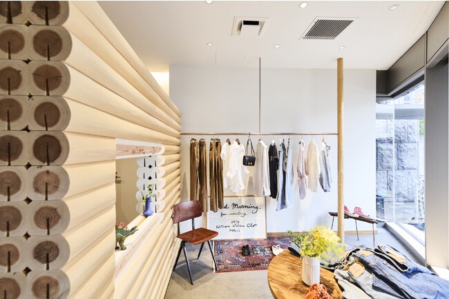 同店では、店舗内装のメイン資材に採用した丸太をはじめ、廃棄デニムを使った別注コレクションの発売など、エコフレンドリーな要素を充実させた店舗運営・商品展開を目指します。また、「ファッションとウェルフェア(福祉)の架け橋」を掲げ、社会的養護下にある子どもたちのサポートを実施して参ります。