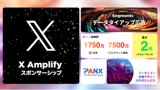 ぴあ朝日ネクストスコープ株式会社(東京都渋谷区、代表取締役社長:木戸 文夫)(以下、PANX)は、X社とのパートナーシップを締結。X広告にて、国内最大級のライブエンタメユーザーのデータマーケティングプラットフォーム「PIA DMP」(※1)を活用し、”最大2倍のパフォーマンス”(※2)を実現する「データタイアップ広告」や「アーティスト・俳優アサイン代行ポスト広告」を含むアライアンス商品「X Amplify スポンサーシップ」を提供開始します。