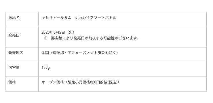 また、『キシリトールガム いれいすアソートボトル』は、遊技場・アミューズメント施設を除く全国の商業施設で2023年5月2日(火)より数量限定で発売いたします。ボトルのデザインは、描き下ろし2種類を含む、全4種類があり、実際にメンバーが選んだ推しフレーバー6種のアソートボトルになっています。