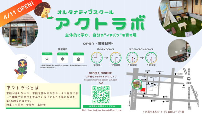 特定非営利活動法人FUNRISE(埼玉県久喜市本町5-4-30)は学校が合わない子どもや放課後の居場所を求めている子どもたちが利用できるオルタナティブスクール(フリースクール)「アクトラボ」を埼玉県久喜市に開設します。オープン日は4月11日火曜日、今後は毎週火曜、水曜、金曜に開設する予定です。