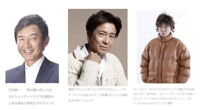 出演者:俳優 石田純一、風間トオル、昭和女子40人程度を予定