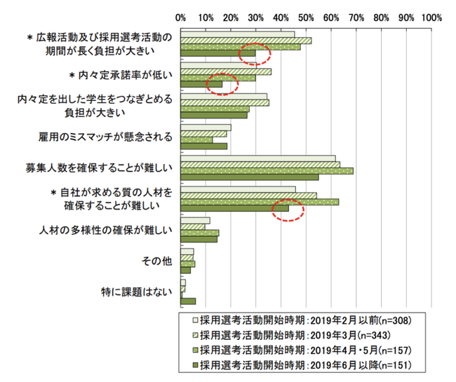 また、令和2年10月に内閣府の出した、企業の採用活動に関する実態調査(概要)によると、採用活動における企業の課題として、「募集人数を確保することが難しい」、「自社が求める質の人材を確保することが難しい」、「広報活動及び採用選考活動の期間が長く負担が大きい」を挙げる企業が多くなっています。(※2)