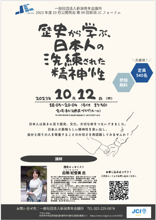 一般社団法人新潟青年会議所では、10月公開例会におきまして、第99回新潟JCフォーラム~歴史から学ぶ、日本人の洗練された精神性~と銘打ち、全国各地での講演や各メディアでもご活躍の白駒 妃登美(しらこま ひとみ)氏をお招きして講演いただくこととなりました。