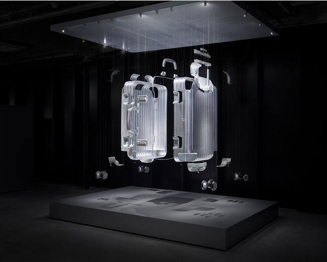 「空港」をイメージさせるエントランスを抜けると、それぞれのテーマが掲げられた「ジオラマ」が登場。RIMOWAのこれまでの歩みを感じられるアーカイブピースの展示や、RIMOWAの工場から運び入れられたアルミニウム製の壁面にステッカーを貼り付ける参加型プログラム、また村上隆さん、藤原ヒロシさん、パティ・スミスさん、ペギー・グーさんなど普段はなかなか目にすることができない個人所有アイテムの展示など、あらゆる側面からRIMOWAのレガシーを感じられる「ジオラマ」が展開されています。