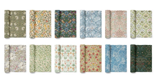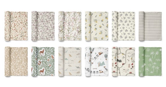 出産のお祝いに人気のウィリアムモリス柄、「ピンパーネル」や「いちご泥棒」「フルーツ」「ウィローボウ」「ウィンドラッシュ」「ゴールデンリリー」、今冬の新作柄の「マリーゴールド」「ローズ&バード」などの12種類とオリジナル柄12種類の全24種類の花束スワドル(おくるみ)を販売しています。(2024年12月現在)