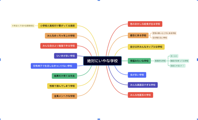 「独裁者がいる帝国のような学校」、「空気椅子で生活しなければいけない学校」、「色のおかしな給食が出る学校」など、自分の経験からだったり、ユニークなアイデアを話している中でたくさん出してくれました。