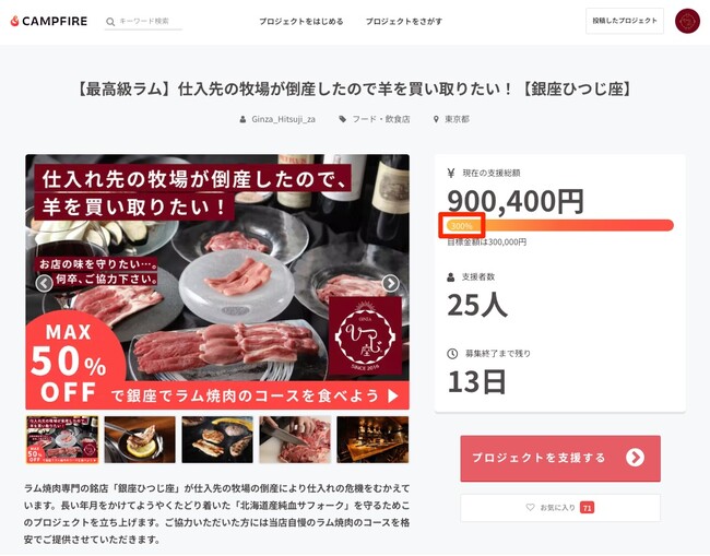 ソーシャルフード株式会社(代表取締役:築山聖志、本社:東京都港区)が経営するラム焼肉専門店「銀座ひつじ座」は、先日3月24日にCAMPFIREにて公開したクラウドファンディングにおいて、わずか4日で100%を達成し、23日目に目標を大きく上回る300%を達成いたしました。ネクストゴール2,030万に向けて突き進みます!