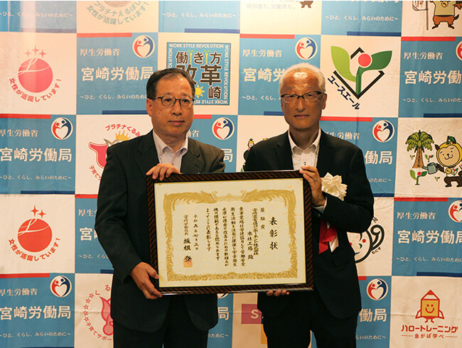 宮崎労働局では、全国安全週間の取り組みとして、毎年、安全衛生水準が極めて高く、他の模範と認められる優良事業場や、長年にわたり安全衛生水準の向上発展に多大な貢献をした団体又は功労者に対し、宮崎労働局長から表彰状を授与しています。