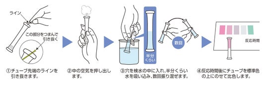 試薬が入ったチューブに検水を吸い込み、反応時間後に吸い込んだ水の発色を標準色と比べることで、水質を測定できます。