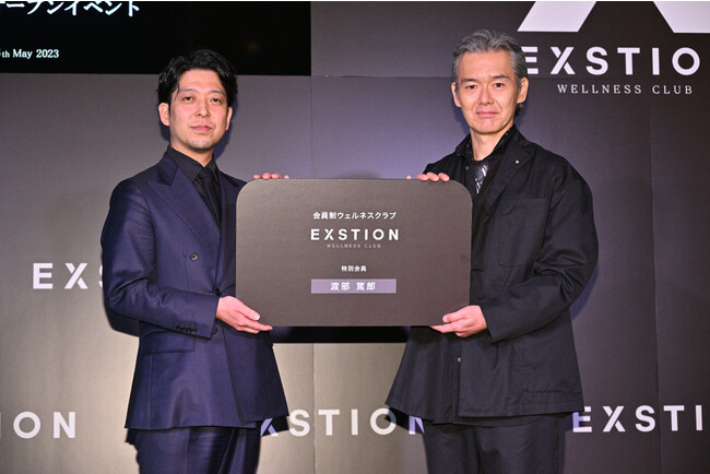 当日は、EXSTIONを運営する株式会社1.1BIRTHS代表取締役 木原 将貴の施設紹介から始まり、特別会員としてご招待させていただいた俳優の渡部篤郎さんにご登壇いただき、EXSTION特別会員就任を祝し巨大特別会員カードを授与しました。