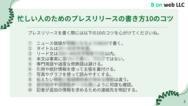 芸術・アート系に特化したウェブマーケティング会社、ビーオンウェブ合同会社(神奈川県平塚市)は、アート団体の広報力強化、新規ファン獲得のためのツール『アート系団体こそプレスリリースを出そう!書き方完全ガイド』を、8月15日~31日まで期間限定で、アート団体支援のため無料公開いたします。https://forms.gle/LYtnD5bq23eqh5mk6からダウンロード可能な本ガイドは、アートを発信する一般的な創造団体だけではなく、障がい者芸術団体、会館・ホール、アートイベントの実行委員会など、アートのジャンルや団体の性質に関係なくお使いいただけます。プレスリリースの基礎から具体的な執筆方法、さらにはアート団体ならではのNG例までを網羅した全39ページの大ボリュームですが、時間のない方は表紙の次、2ページ目を読むだけでもコツが掴めるように製作いたしました。